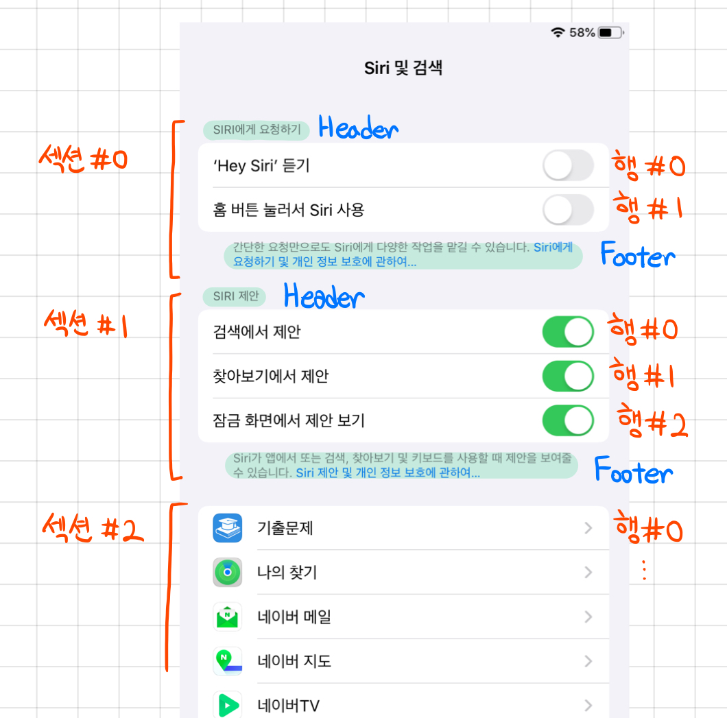테이블뷰는 스크롤을 올리고 내리는 액션으로 많은 양의 정보를 보여줄 수 있는 형태의 UI 입니다. 일렬로 쭉 세워놓은 정보들이라 볼 수 있겠네요. 주로 수직방향으로만 스크롤이 가능합니다. 이 행들은 섹선 (Section) 이라는 단위로 묶을 수 있고, 헤더와 푸터를 통해 섹션의 위아래에 추가로 정보를 담을 수도 있습니다.