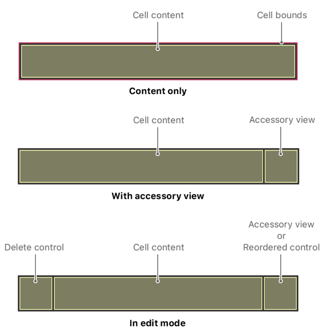 셀은 기본적으로 "Content Only", "With Accessory View", "In Edit Mode" 3가지의 구조를 가지고 있습니다. 이 중에서 주로 사용되는 것은 With Accessory View 입니다.