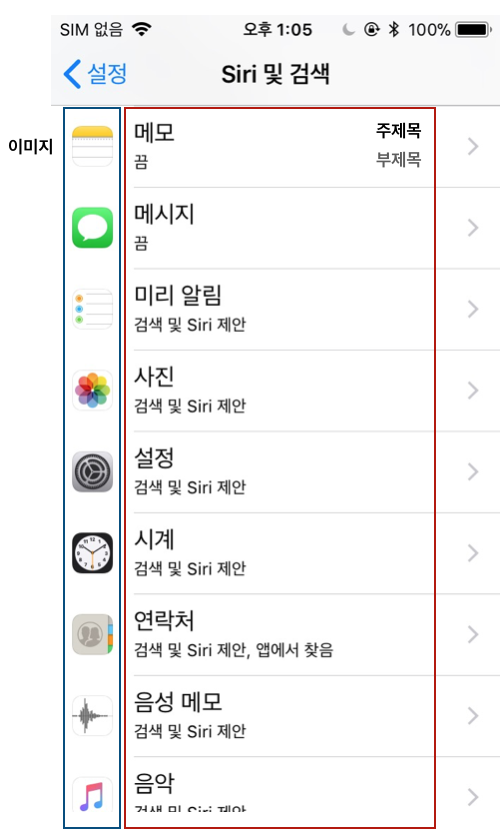 기본적으로, 셀에는 이름, 설명, 사진 3가지의 프로퍼티가 정의되어 있습니다. 만약 이미지가 포함된다면 이미지가 왼쪽에 삽입되고 이름과 설명이 오른쪽으로 밀려나 위치하게 됩니다.