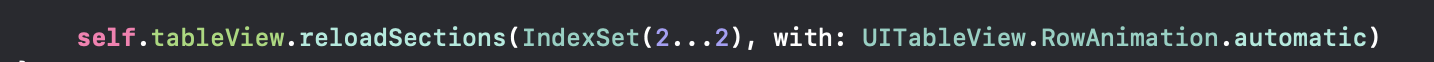 이제 작성한 데이터를 이용해 테이블 뷰를 새로고침해줘야겠죠? 기본적으로 tableView의 새로고침은 reloadData()를 사용합니다. 그런데 이건 테이블뷰를 구성하는 모든 데이터를 다시 불러오는 메서드이기 때문에 제일 뒤에 추가된 데이터만 불러오면 되는 우리의 테이블에는 성능을 잡아먹는 부적절한 메서드라고 볼 수 있어요. 2번 섹션의 데이터만 다시 가져오는 메서드는 self.tableView.reloadSections() 를 사용해주면 됩니다. 이 메서드는 2개의 인자를 가져가는데, ''몇번 ~ 몇번의 섹션을 새로고침해줄 것인가?'' + ''새로고침 애니메이션은 어떻게 할것인가?''의 데이터를 전달하면 됩니다. 지금 작성하는 코드에서는 2번 섹션만 초기화하면 되고 애니메이션은 자동을 사용해볼게요.