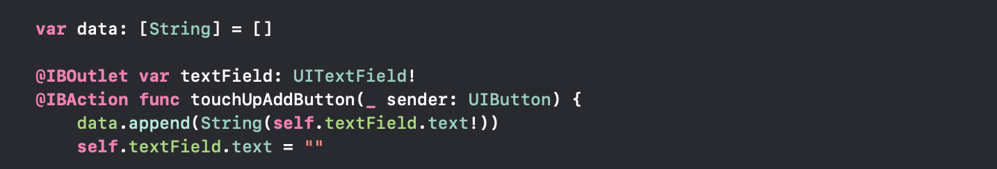 먼저, 2번 섹션에 들어갈 데이터를 배열에 저장해, 각 원소를 각각의 셀에 대응시키는 방법으로 데이터를 관리하도록 합시다. String 타입의 빈 배열인 data 를 선언해두고, 버튼을 누르면 스토리보드에 넣어둔 textField 에서 문자열을 받아와 값을 넣어주도록 만들어봅시다.