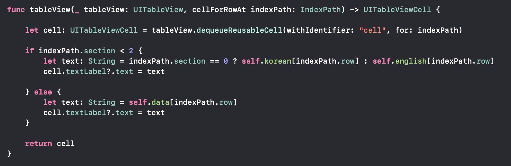 만약에 이 새로고침 메서드를 호출하게 되면, 이전 포스팅에서 작성했던 테이블뷰를 처음에 구성하는 메서드를 컴파일러가 알아서 호출해서 데이터를 받아가게 될텐데, 그때를 위해 2번 섹션에서 필요한 데이터를 가져가 셀의 타이틀로 만들어줄 수 있게 tableView() 메서드에 코드를 추가해줍니다.