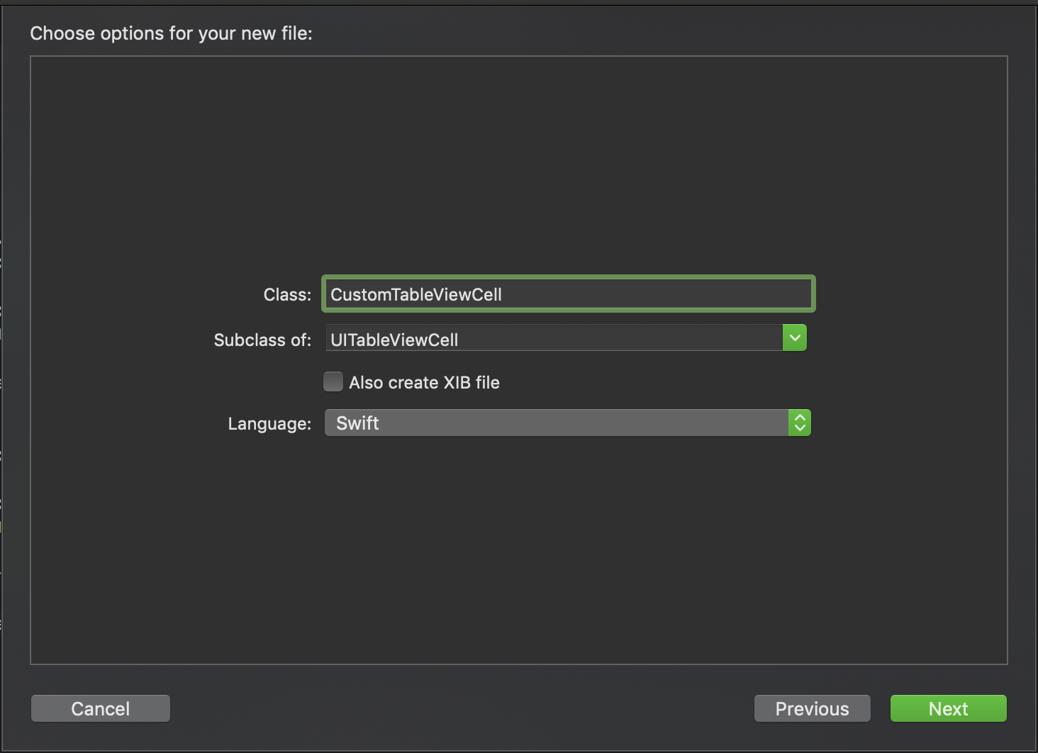 해당 Custom Cell을 담당할 "CustomTableViewCell" 클래스를 작성해줄게요. [ ⌘ + N ] 으로 새로 만들기 창을 열어서 코코아 터치 클래스를 새로 만들어줍니다. 여기서 수행할 역할이 테이블 뷰 셀을 관리할 예정이니 UITableViewCell의 하위클래스로 만들어줍시다. 이름은 대충 아래처럼 지어줄게요.