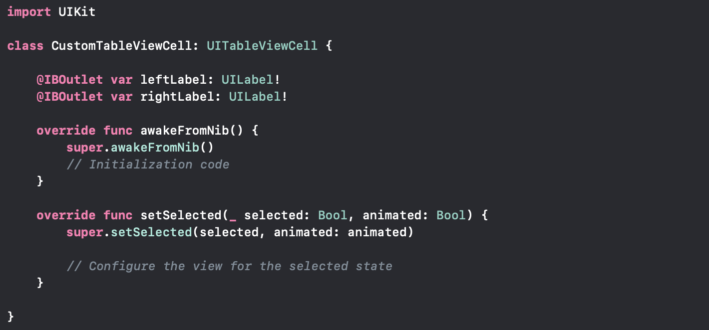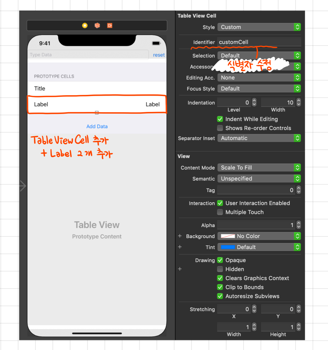 여기서 커스텀셀에서 관리해줄 항목들을 작성해줘야 하는데, 우리는 셀에 레이블이 2개가 있으니, 이를 연결해줍시다. 표준 스타일의 셀에는 Title 이라는 레이블이 자동으로 연결되어 있던거였군요!