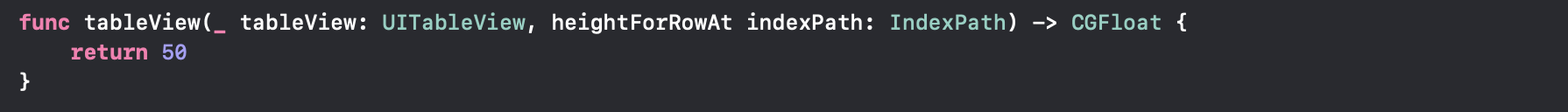 tableView를 입력해두고, height가 들어가는 메서드를 찾으니 요게 나오더군요. 얘도 똑같이 indexpath를 인자로 받아서 어느 섹션의 몇번째 행의 셀이 어느정도의 높이를 가질지 return 값으로 결정할 수 있는 메서드입니다. 귀찮으니 모든 셀의 높이를 50으로 통일해버릴게요. 이 코드를 ViewController에 넣어주고난 다음 새로 빌드를 해주면 다음과 같은 결과를 얻을 수 있습니다.