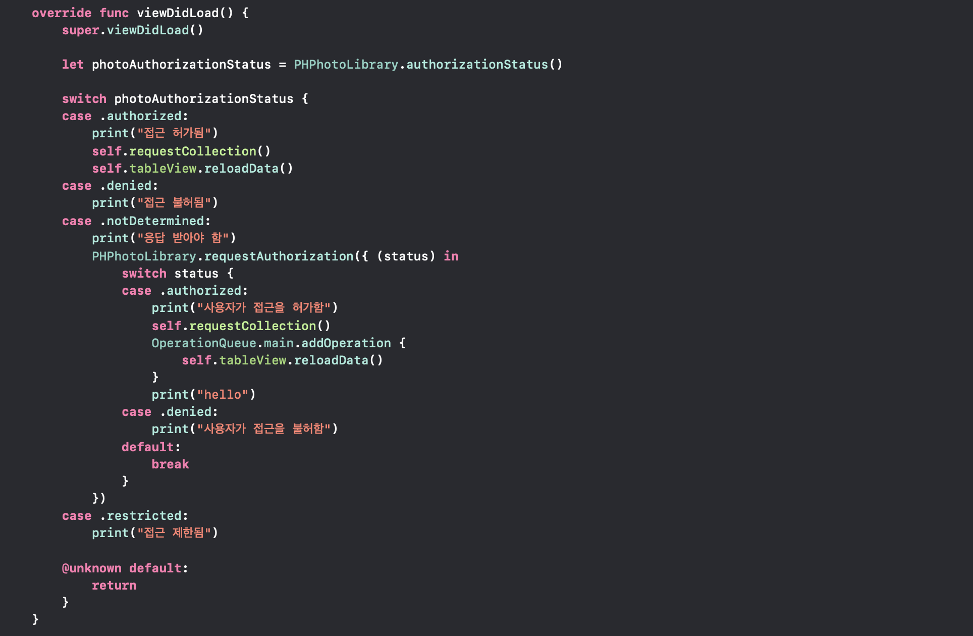 PHPhotoLibrary의 권한허가상태를 받아와서, 이 값에 따라 Switch 구문으로 분기해주도록 합시다. 허가를 받았다면 데이터를 요청하고 reload 해주면 되고, 거절을 받았다면 로드를 하면 안되겠죠? 만약에 아직 응답을 받지 않았다면 대답을 요청합니다. 이 대답에 대해서 switch 구문으로 분리해서 각 필요한 작업을 수행해줍니다. OperationQueue.main.addOperation은 동기/비동기와 관련된 내용으로, 뒤에서 다시 한번 포스팅으로 작성할 예정입니다!