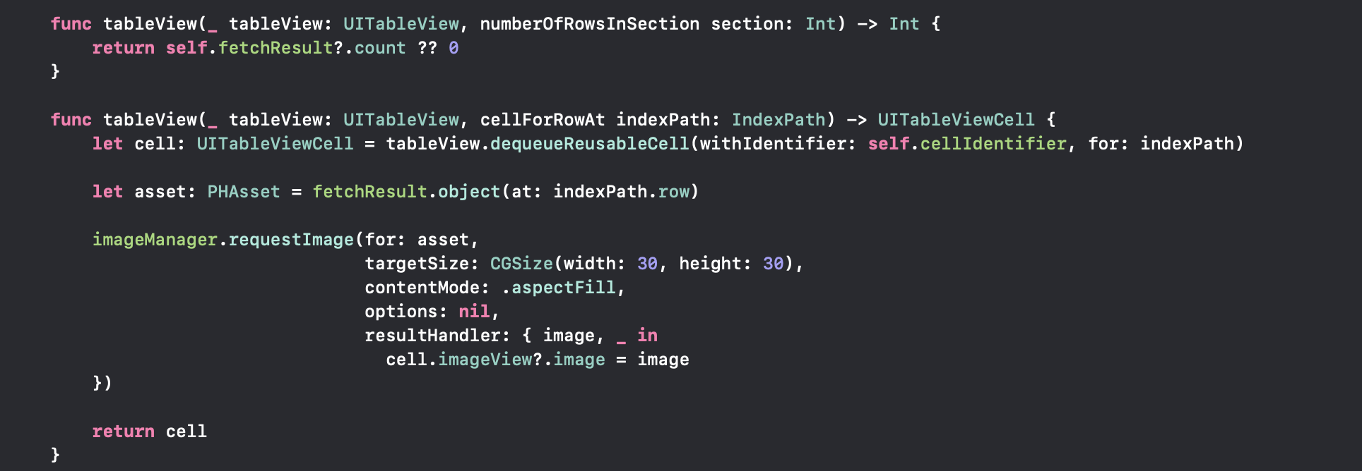 셀을 설정하는 함수에서는, 메모리관리를 위해 dequeueReusableCell을 이용합시다. PHAsset 타입의 상수를 fetchResult.object(at: ) 으로 각 행에 맞는 사진 데이터를 가져와 지정해줍니다. 아까 만들어준 PHCachingImageManager가 드디어 나왔네요! 이 에셋에 대해 지정한 사이즈와 모드로, cell.imageView.image에 넣어줍니다. 그리고 설정한 cell을 반환해줍니다.