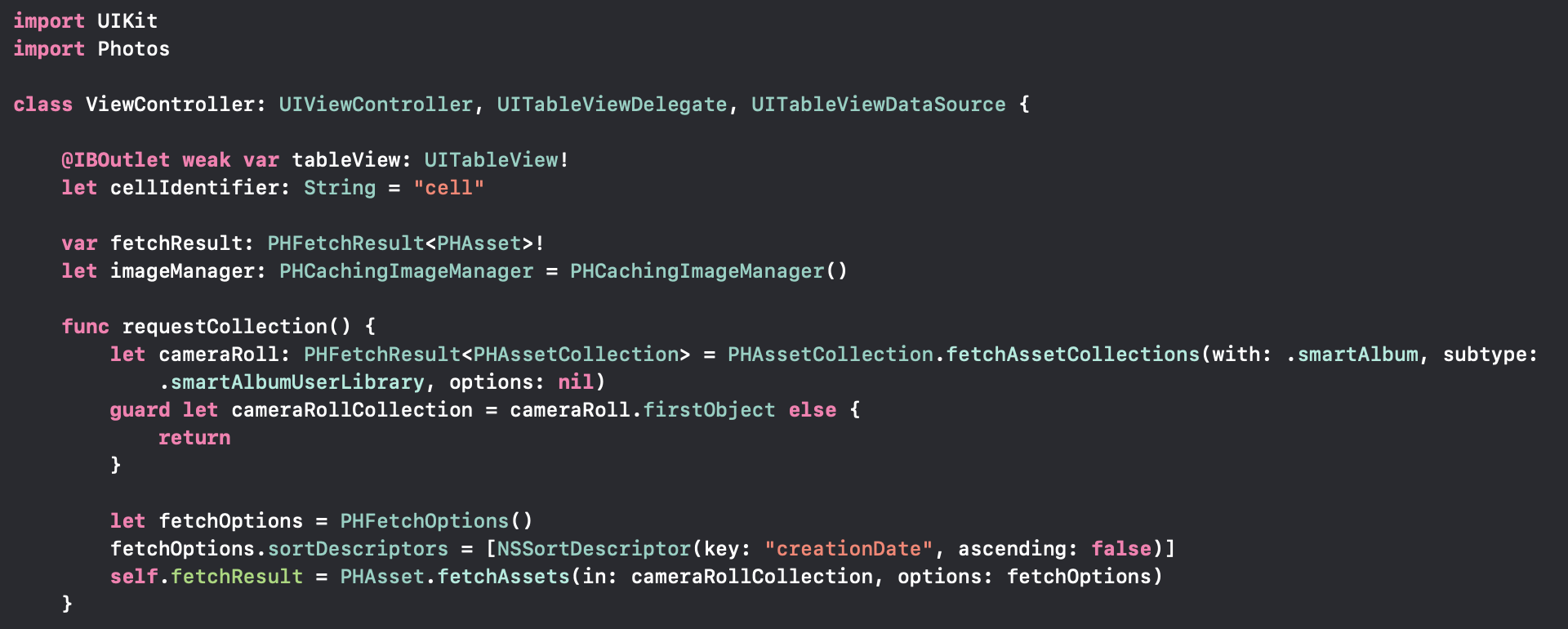 PHAsset을 가져와 저장해줄 리스트인 fetchResult를 만들어줍니다. 그리고 다량의 섬네일을 빠르게 가져올 수 있는 PHCachingImageManager 를 만들고 imageManager라는 이름으로 선언해줍시다.