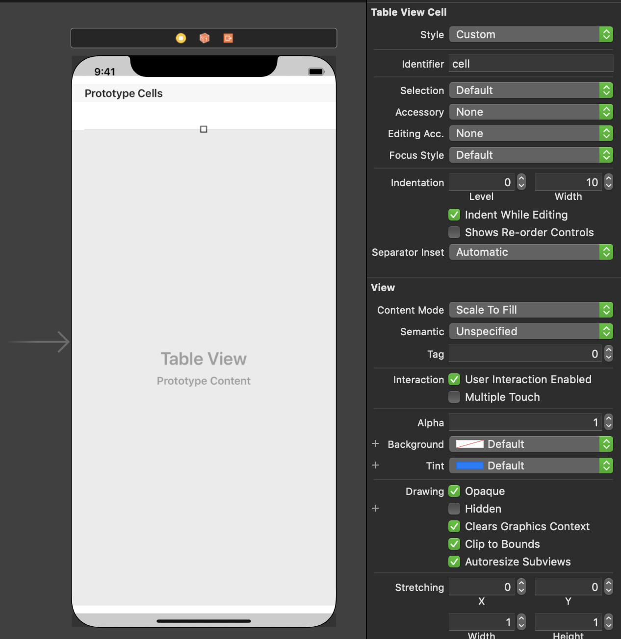 이렇게 간단하게 스토리보드를 구성했습니다. 그냥 TableView 하나 올리고, ReuseIdentifier가 "cell" 인 셀 하나를 올려줬어요.