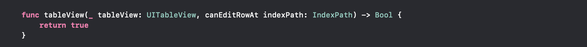 tableView의 Delegate 중에서 canEditRowAt 이라는 텍스트가 들어간 메서드를 가져와줍니다. 어느 셀을 편집가능하게 만들지를 선택하는 메서드로, 우리는 모든 셀이 현재 사진을 가지고있으니, 모두 true를 반환해 삭제가 가능하게 만들어줍시다!