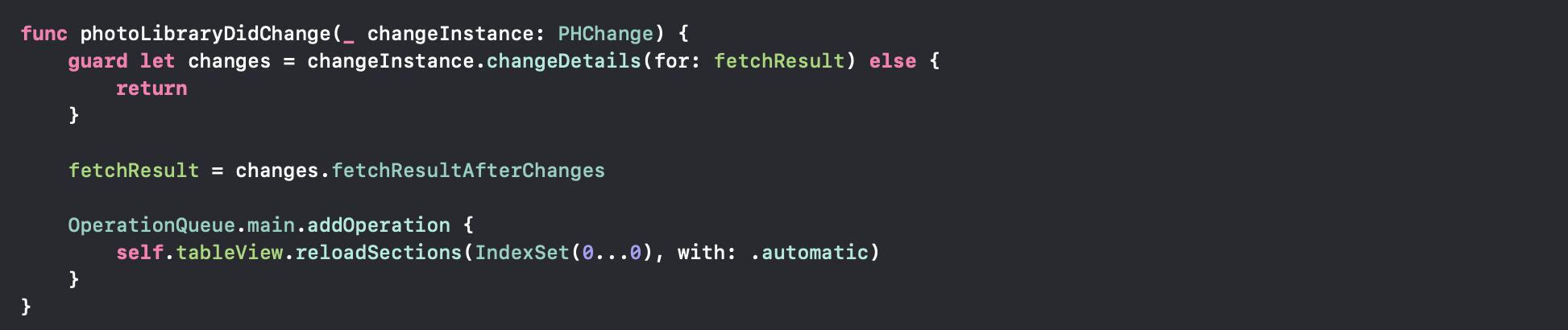 아까전에 프로토콜로 채택했던 변화를 감지하는 기능이 여기에 들어갑니다. 만약 사진 라이브러리가 변경된 경우에, fetchResult의 changeInstance의 changeDetail 값을 받아와서 변경된 값이 있다면 ( 변경사항이 nil이 아니라면 - 여기서는 삭제를 의미하겠네요 ) 바뀐 fetchResult로 tableView를 Update 해줍니다.