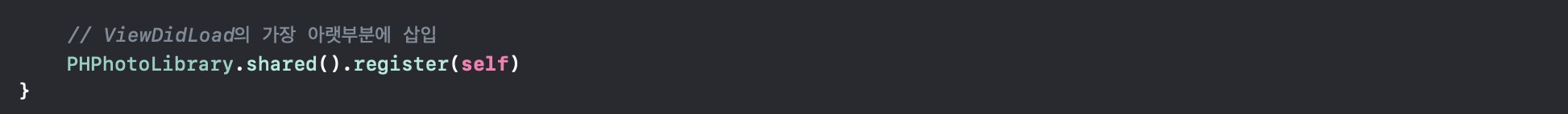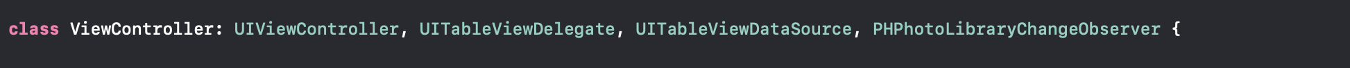 그리고, ViewDidLoad에 이 변화를 감시하는 observer로 정보를 알릴 대상(register)으로 이 클래스를 선택해줍니다. 사진첩의 변경이 있으면, 여기에 알려지게 되고, 그에 따라 앨범 변경에 대한 메서드가 실행되겠네요.