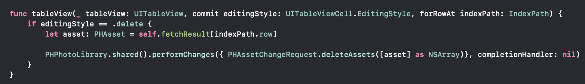 그 다음, commit editingStyle 이라는 텍스트가 들어간 델리게이트를 작성해줍니다. editing.style이 delete인 경우에 대해서만 작성하려 하므로 if문으로 분기해줍시다. 삭제를 원하는 데이터를 fetchResult(앨범에서 가져온 사진의 콜렉션임)에서 가져와서 asset 상수에 저장해줍니다. 이 데이터를 앨범에서 삭제하면 되는데, PHPhotoLibrary.shared().performChanges() 라는 메서드로 사진의 변경에 대한 메타데이터 수정 작업을 수행할 수 있습니다. 위와 같은 방식으로 작성해줍시다.