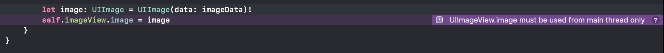 위 코드처럼, 데이터를 다운받아오는 부분을 OperationQueue().addOperation 안에 넣어주면 다른 스레드에서 해당 부분을 처리하게 됩니다. 그러나, 맨 마지막 줄에 self.imageView.image = image 부분에서 다음과 같은 유니콘 찌찌맛 에러가 발생하게 됩니다.