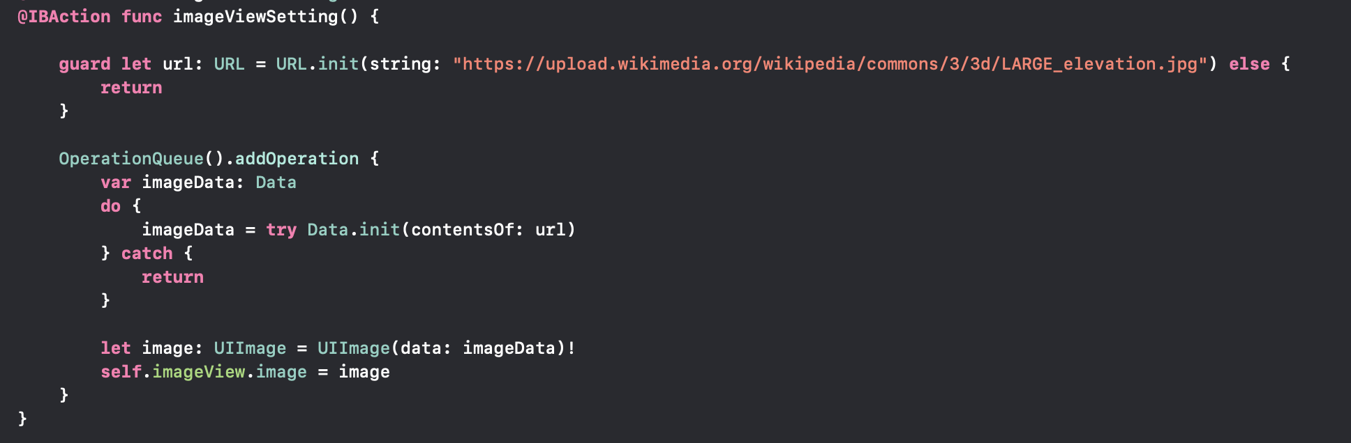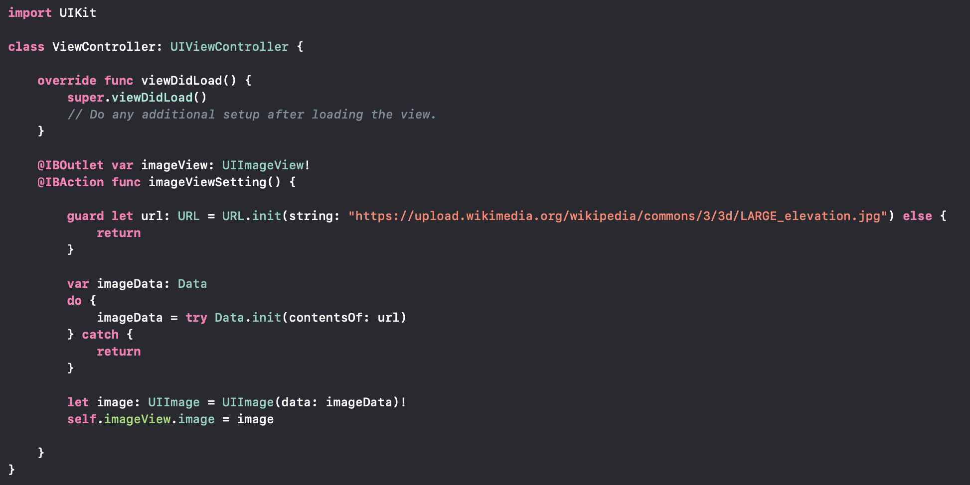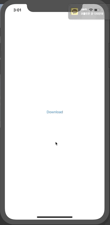 이렇게 스토리보드를 작성해주고, 작성한 코드의 IBOutlet과 IBAction을 연결해주었습니다. 위 이미지와 같은 코드를 작성해주었습니다. 버튼을 누르면 url을 저장하고, 이를 통해 데이터로 만들어 준 다음 imageVIew에 다운받은 이미지를 넣어주는 코드입니다. guard 나 try 구문때문에 복잡해보일 뿐이지, 코드는 생각보다 간략해요! 이 코드를 실행시켜주면 아래와 같은 결과를 얻을 수 있습니다.