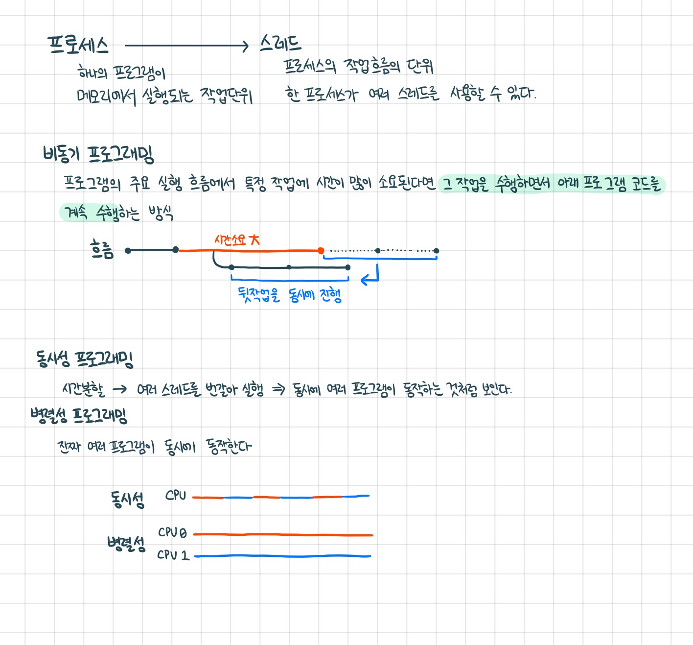 느낀 바를 토대로 간단히 요약하자면, "여러명이 병렬적으로 일하게 만들기" 라고 할 수 있을 것 같네용. 작업 큐에 넣어 다른 스레드에서 작업을 수행시키고, 필요하면 또 메인 스레드를 호출해서 작업을 수행시키고, 이런 방식으로 진행하는게 비동키 프로그래밍이라고 생각됩니다.