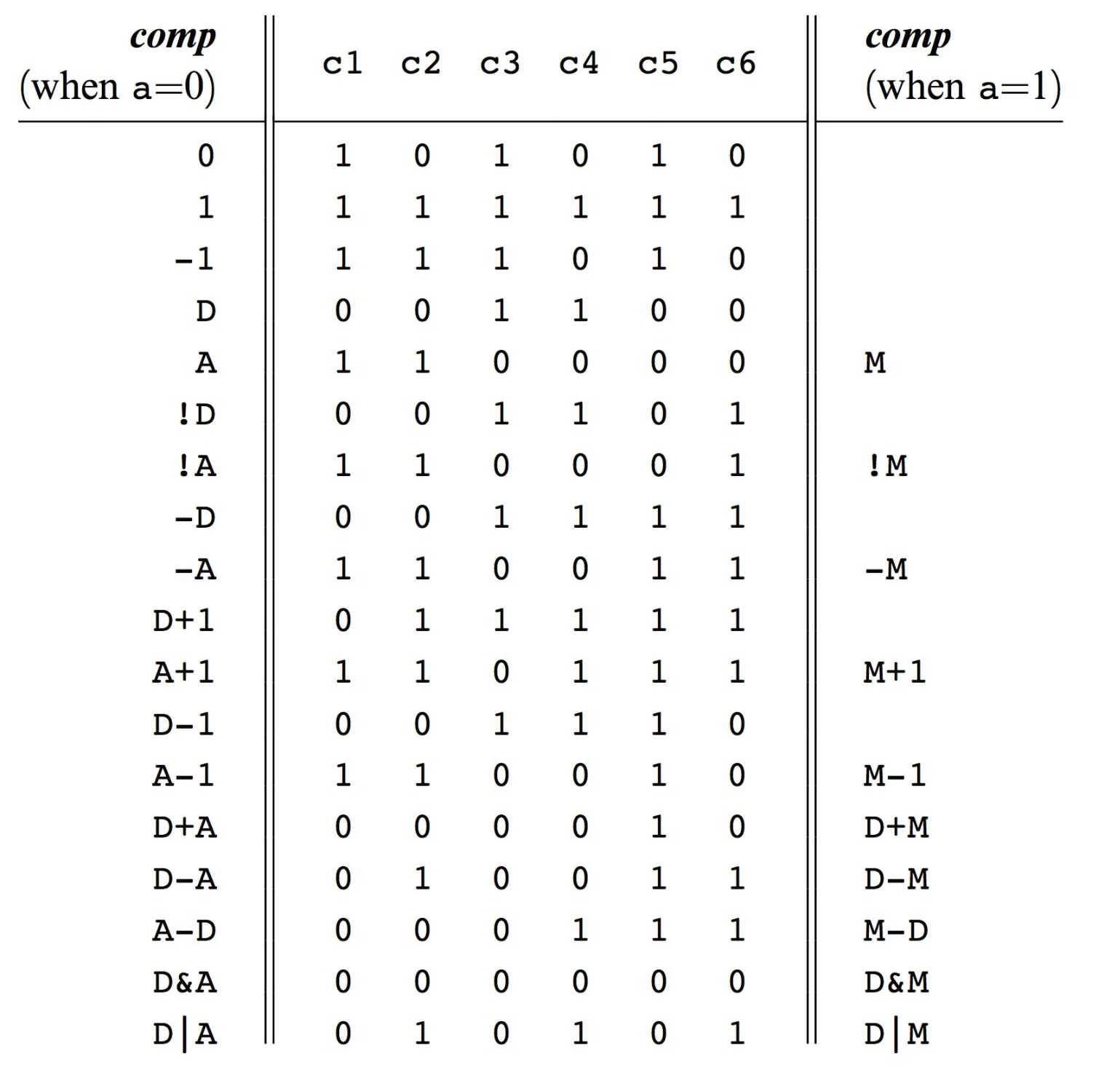 -> 2진코드로 111A CCCC CCDD DJJJ (첫 Bit는 1, A와 C는 comp, D는 dest, J는 jump Bit이 된다.)