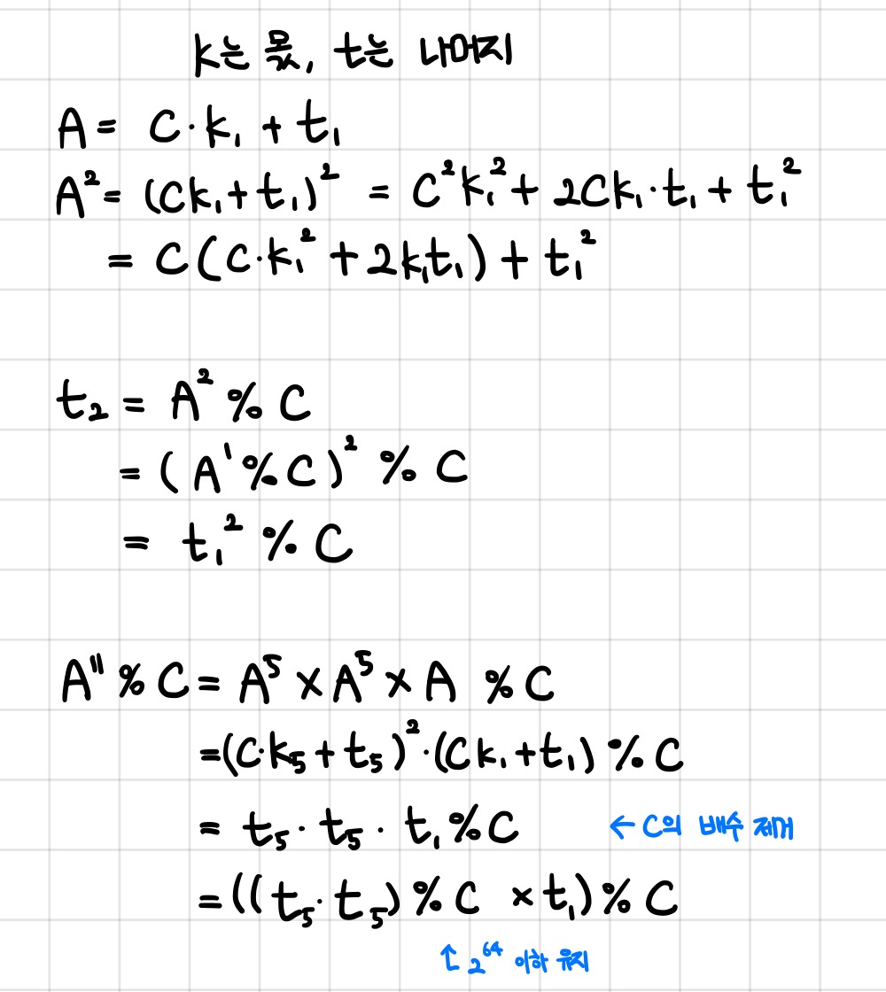위와 같은 방법으로 지수가 1일 때부터 필요한 값들을 만들면서 올라오면 필요한 나머지를 구할 수 있다. 여기에서 P가 홀수일 때는 3개의 나머지를 곱하게 되는데, 만약 C 값이 2^32에 가까워서, 곱해줄 나머지 값들도 2^32에 가깝다면 3개의 나머지를 곱했을 때 2^96에 가까운 값이 나오게 되므로 long long 자료형을 사용해도 정상적으로 값을 담을 수 없다. 따라서 우리가 필요한 값만 사용해주면 되므로, ((K^P’ * K^P’ % C) * K1) % C 와 같은 식을 사용하여 미리 나머지를 구해 long long 자료형의 범위인 2^64 범위 내에 담을 수 있게 해준다.