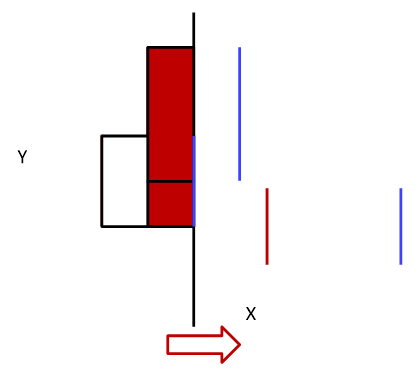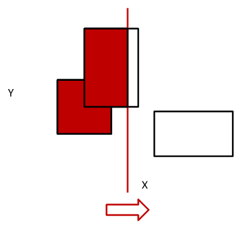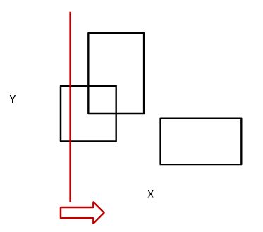 기본적으로 Y의 범위가 0~30000으로 충분히 배열로 저장 가능한 범위이기에 현재 X에 대해 Y가 지도에 해당하는지를 확인하기 위해 Y의 활성화 상태를 검사할 수 있는 배열 ys을 만들어준다. X를 왼쪽에서 오른쪽으로 옮기면서 전체 면적에 추가하고, 지도에 대응하도록 ys를 업데이트 해준다. 아래 그림에서 붉은 면적이 계산 완료된 전체 면적에 해당하고, 붉은 선 위에 있는 사각형 면적이 현재 추가중인 면적에 해당한다. 여기에 사각형 면적이 얼마나 되는지를 검사하기 위해 ys를 업데이트 해준다.
