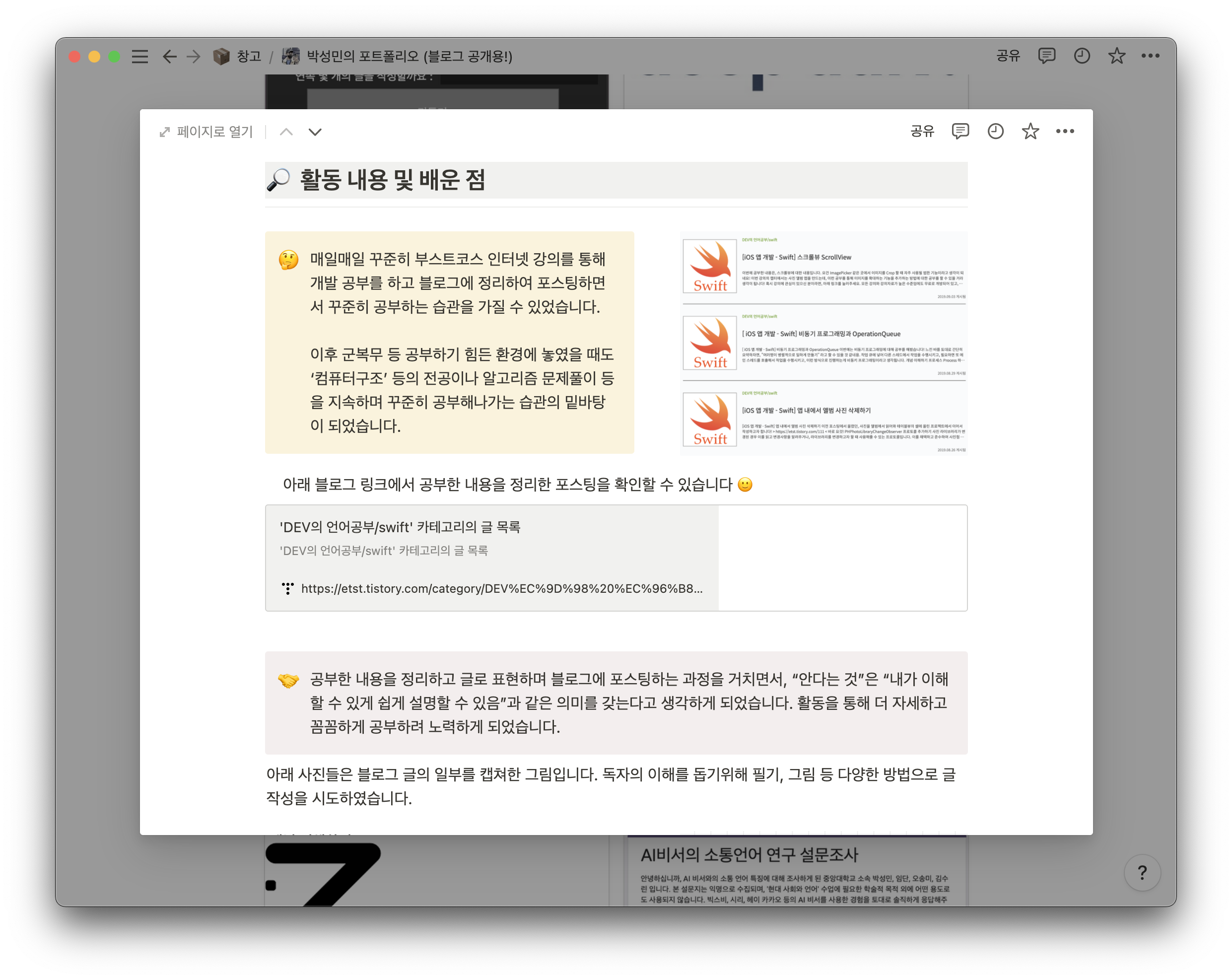 그런데, 2기 아카데미 분들을 만나면서 이렇게 작성한 포트폴리오를 보고 도움이 많이 되었다고 해주신 분들을 몇 분 만나뵙고 나서, "아 이게 다른 사람들을 만날 수 있는 도구가 될 수 있겠구나!" 라는 생각이 들어서 다시 올려둡니다 :)