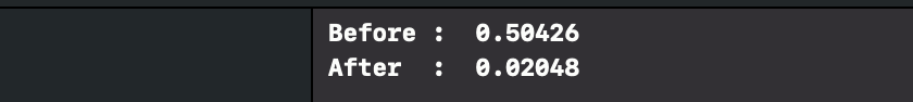 요렇게 개선하고 나서 코드 실행 타임을 체크해보니, 25배 가량 빨라진 것을 확인할 수 있다.