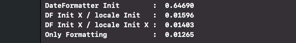 그 결과는 다음과 같다. 여기만 가지고는 DateFormatter를 여러번 생성하는게 그렇게 크리티컬한 이슈인지 파악하기 어렵다. 아니면 컴파일러가 알아서 잘 최적화를 진행한 것이거나?