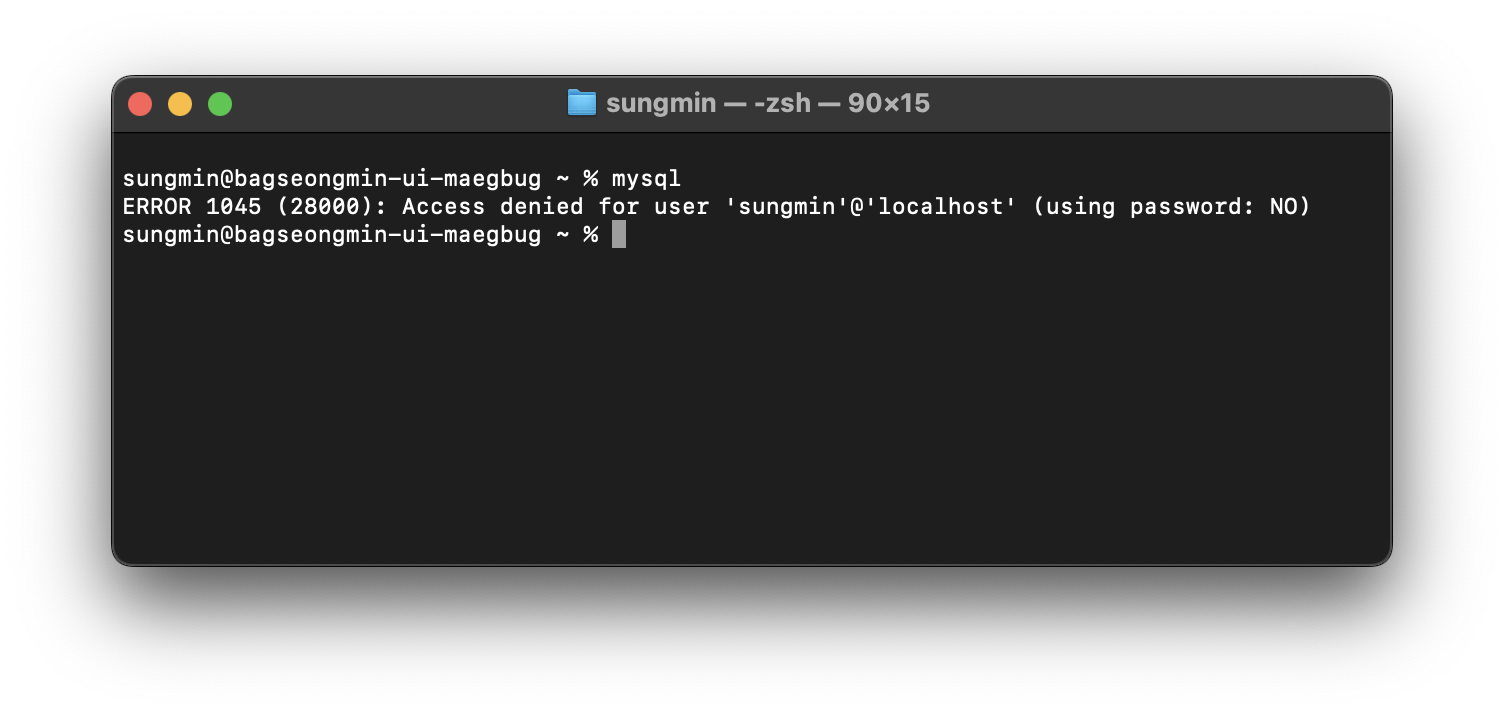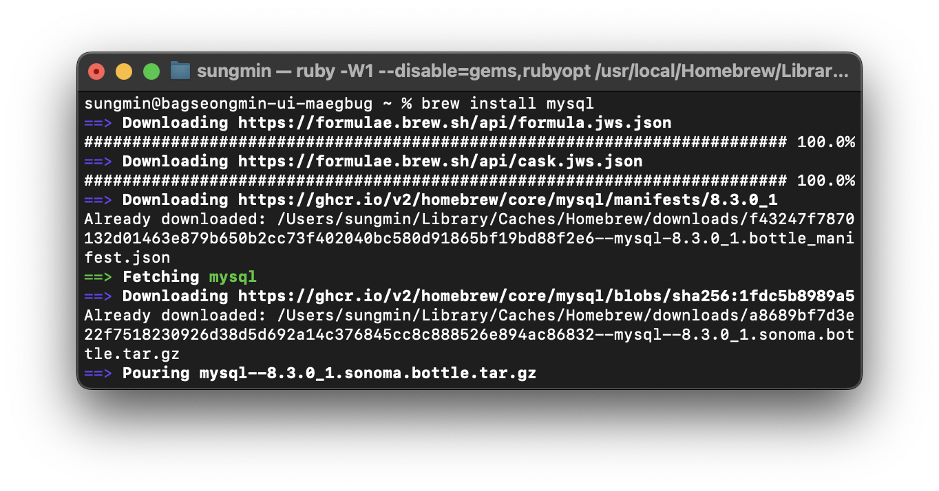 영상에는 나오지 않았지만, terminal에서 mysql 조작을 위해서는 mysql을 아래 방식으로 설치해줘야 한다. brew를 통해 설치해주면 간단하다. 우선은 아래처럼 mysql 이라는 명령어를 입력했을 때 실행이 되는지만 확인하면 된다.
