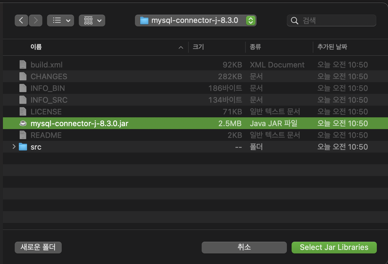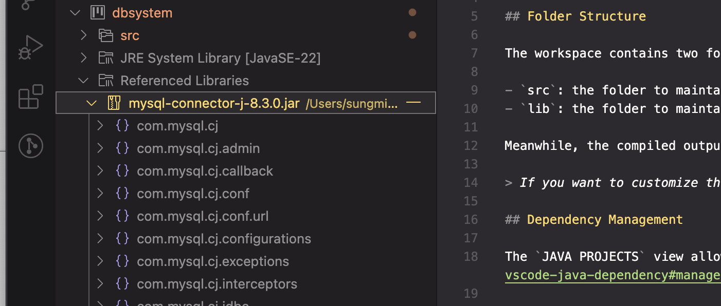 vscode의 탐색기에서 에디터 쪽을 접어보면 아래에 JAVA PROJECTS 라는 메뉴가 있다. 여기에서 Referenced Libraries 메뉴의 오른쪽 + 아이콘을 눌러주고, 앞에서 다운로드한 connector j.jar 파일을 연결해주면 된다.