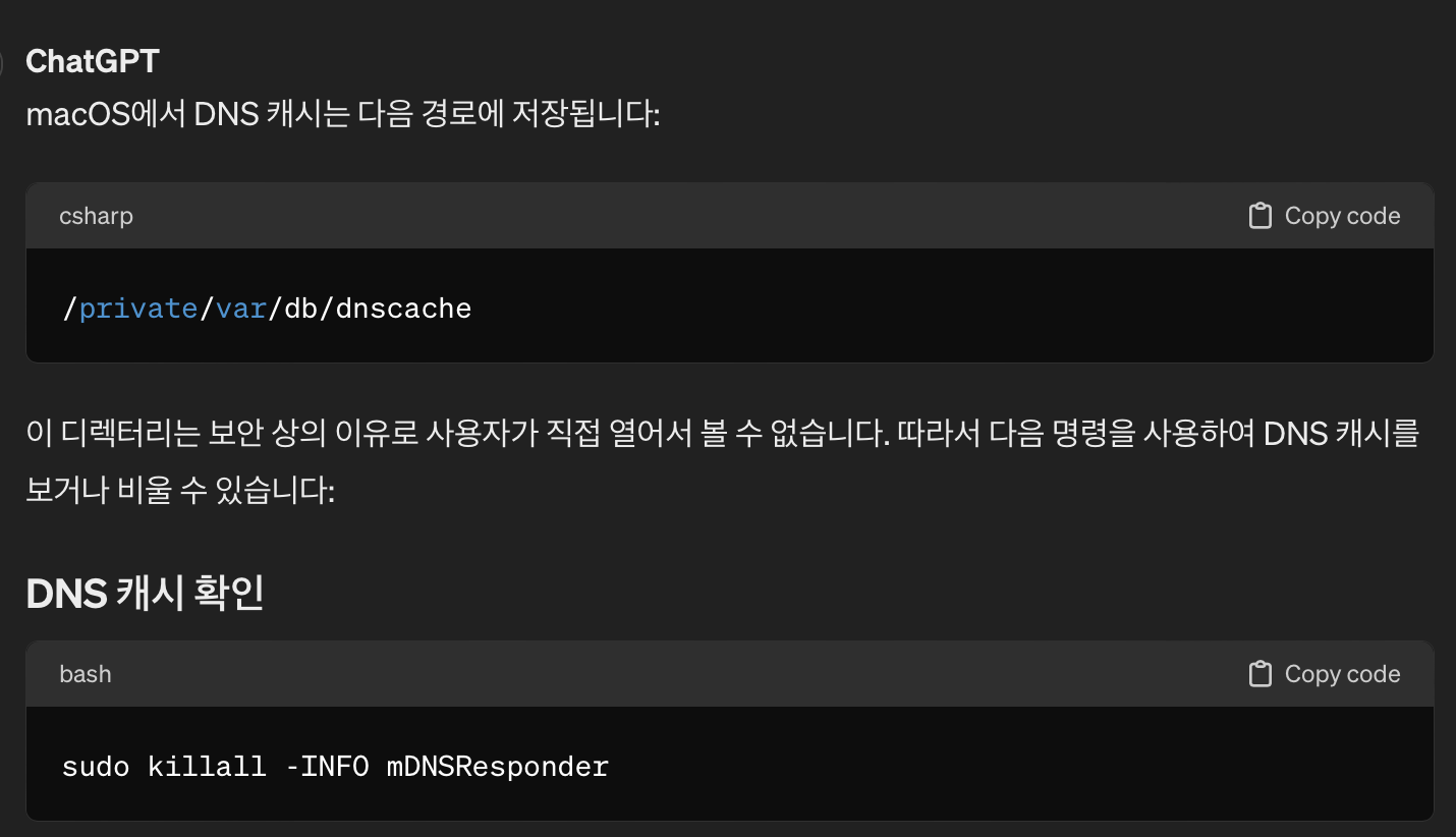 - 그 다음에는 DNS Cache를 찾아본다. 이전에 질의한 IP 주소들을 캐싱해둔 파일에서 찾고자 하는 도메인에 대한 IP 주소를 확인할 수 있다.GPT를 찾아보니 이런 명령어로 쉽게 dns 캐시의 내용을 확인할 수 있다고 했는데, 이번에도 출력이 텅텅 비어있었다. 나의 맥북은 DNS 캐시를 알아서 새로고침 하면서 관리를 하고 있었던건가 ?~? 요 부분은 좀 더 확인해봐야겠다.