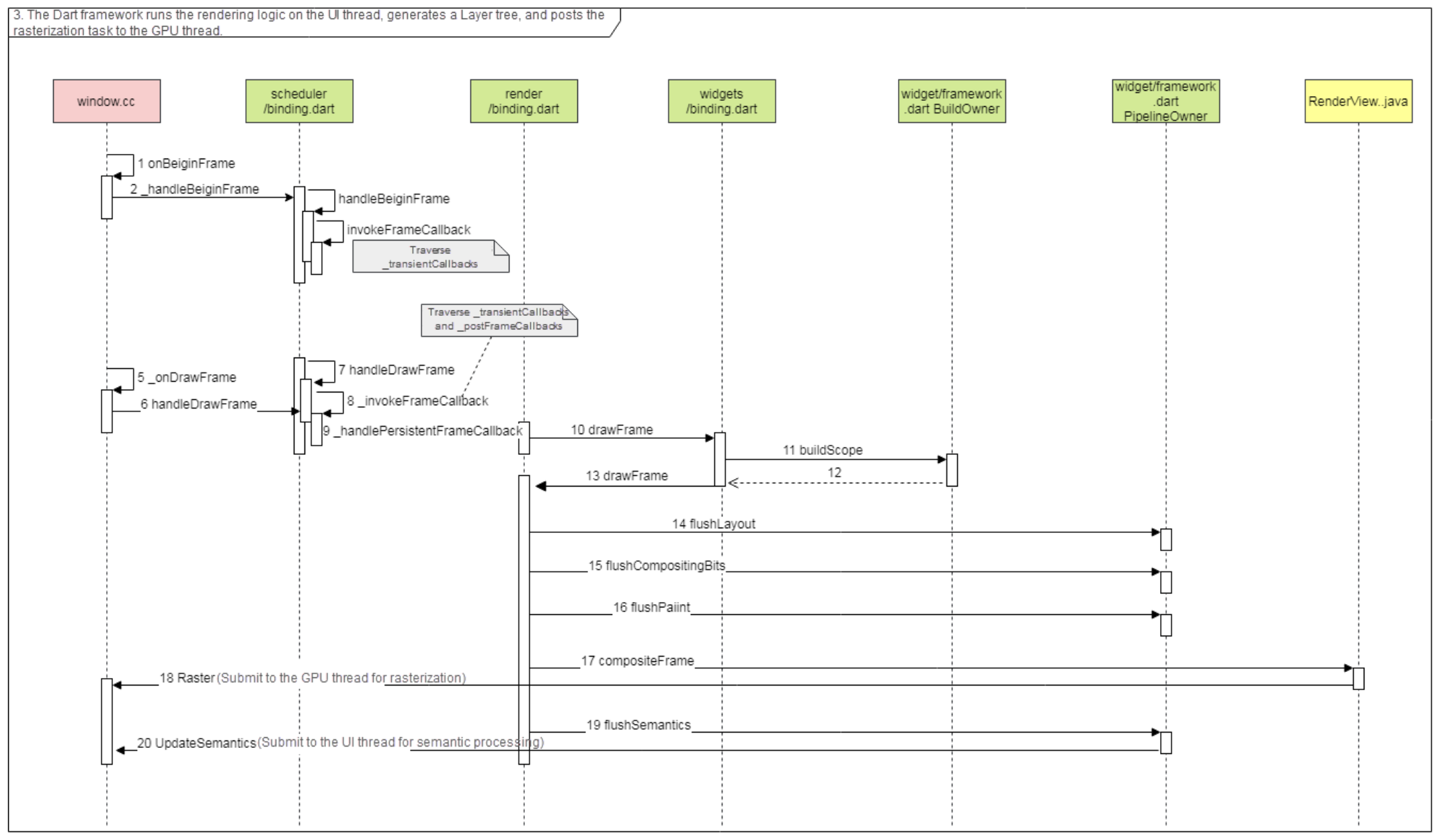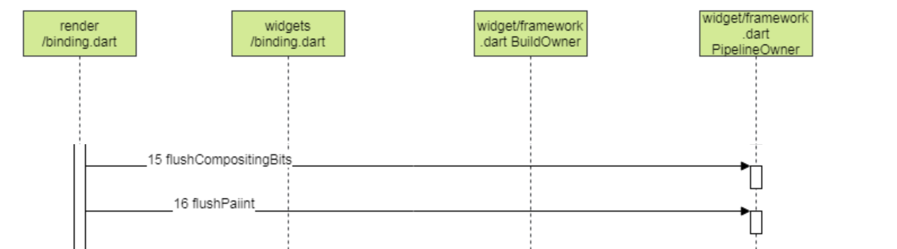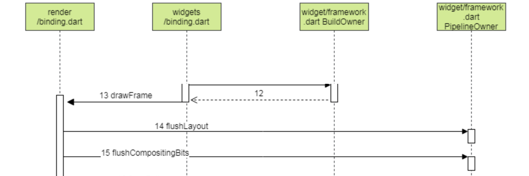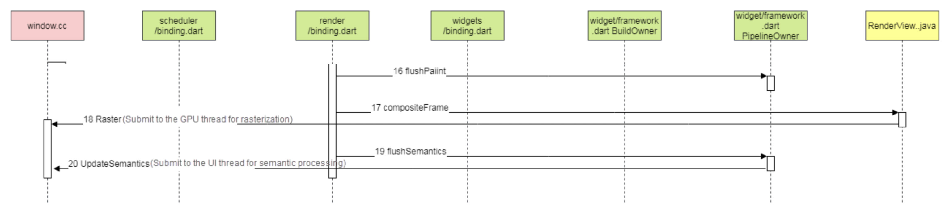 RenderBinding::drawFrame()함수의 호출로, Widget Tree 상에서 새롭게 그려야하는 위젯들을 새로 그려낸다.- Widget Tree의 업데이트에 이어서 Render Tree를 업데이트하며 그려낼 위젯들의 픽셀화(이미지화)를 처리한다.