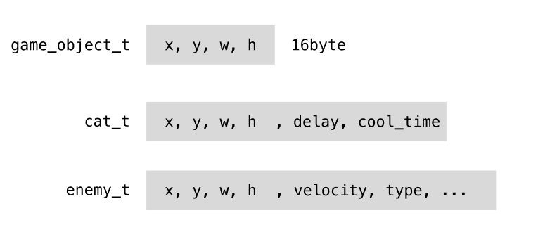 요렇게 cat_t 와 enemy_t 두 가지 구조체에서 중복되는 부분에 대해, 순서까지 똑같이 맞춰서 game_object_t 구조체 타입을 하나 만들어준다.