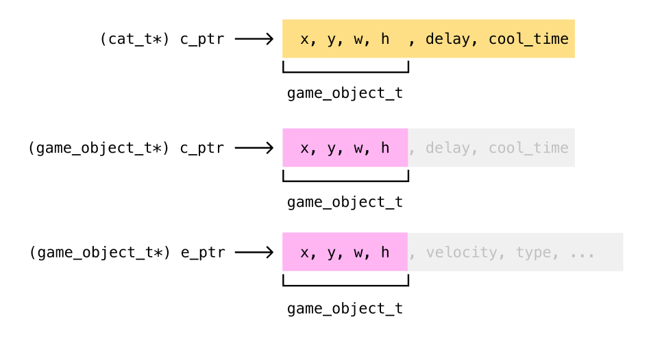 그렇다면, cat_t*와 enemy_t*를 game_object_t* 로 형변환 했을 때, 메모리 상 해당 주소에는 game_object_t의 데이터가 있기 때문에, pos_x, pos_y의 값을 정상적으로 변경할 수 있지 않을까? 라는 아이디어.