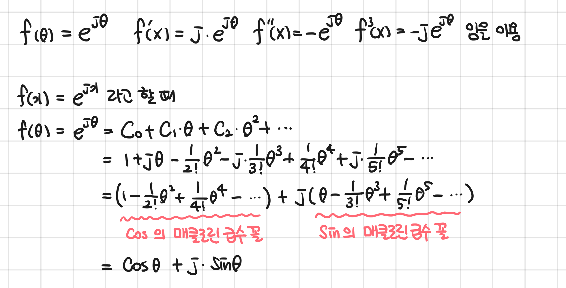 이를 활용해, $e^{j\theta}$ 를 매클로린 급수를 활용해 다항식의 형태로 나타내보면 다음과 같이 유도할 수 있다.