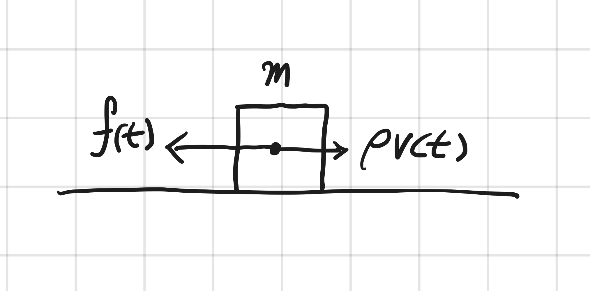 아래 그림처럼 어떤 사물이 $m$ 의 질량을 가지면서, 왼쪽으로 $f(t)$ 만큼의 힘을 전달할 때, 오른쪽으로는 $\rho v(t)$ 만큼의 힘을 저항+마찰로 받을 때의 알짜가속도를 구해보자. 여기에서 전달하는 힘이 input, 그에 따른 가속도(속도)가 output 으로 생각할 수 있다.