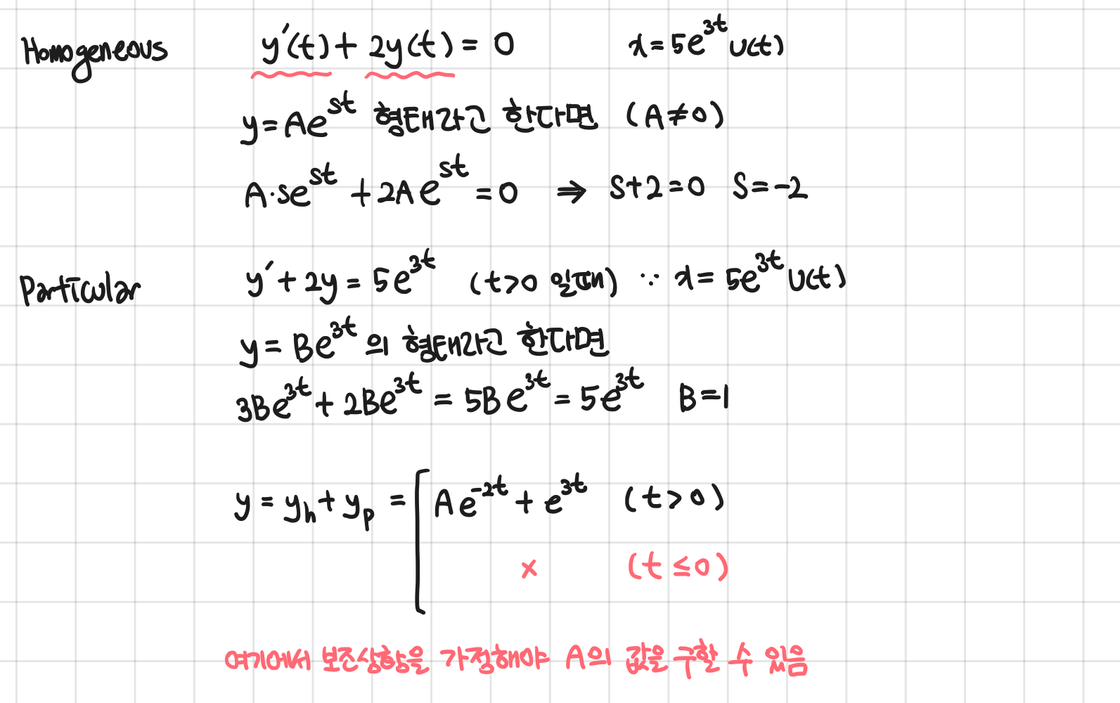 이때, 두 식을 더하더라도 여전히 동일한 미분방정식의 형태를 보인다 → 오! 그러면 내가 진짜로 찾고싶었던 건 Homogeneous + Particular 인 식을 찾고싶은거임 (가만히 있을 때에도 성립 + 입력을 가했을 때에도 성립)
