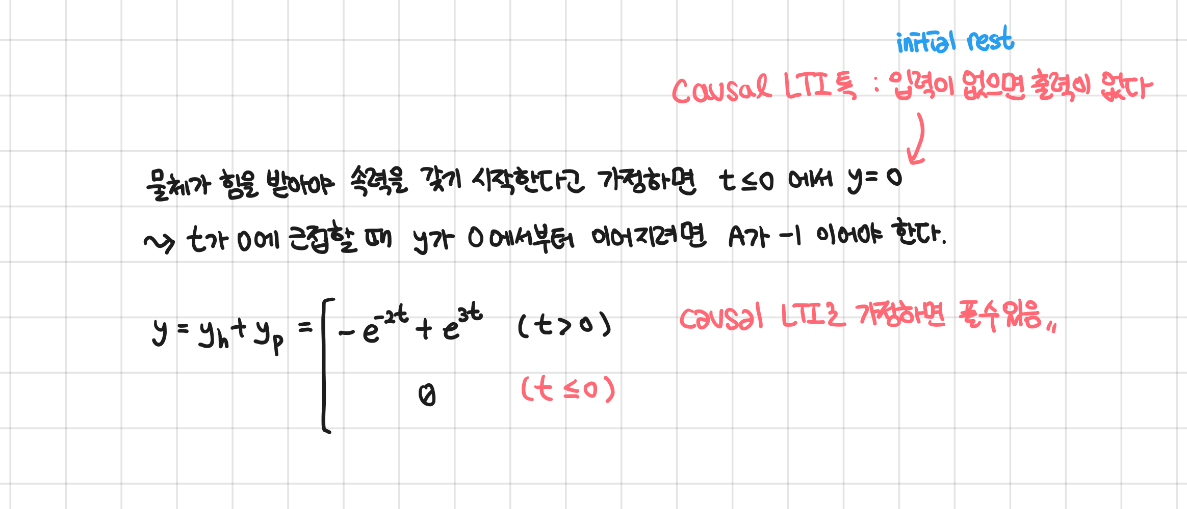 이때 우리가 해결하려는 문제가 Causal LTI 라고 가정하면 이 값들도 찾아낼 수 있다. Causal LTI의 특징은 Initial Rest로, 입력이 없을 때 출력이 없다는 전제조건을 가진다. 따라서 t가 0이거나 이전일 때는 입력이 없으므로 출력 또한 없다고 보고 t=0일때의 출력을 0으로 만들어줄 수 있다. 그리고 이 덕분에 그래프가 연속되기 위한 A 의 값을 찾을 수 있다.