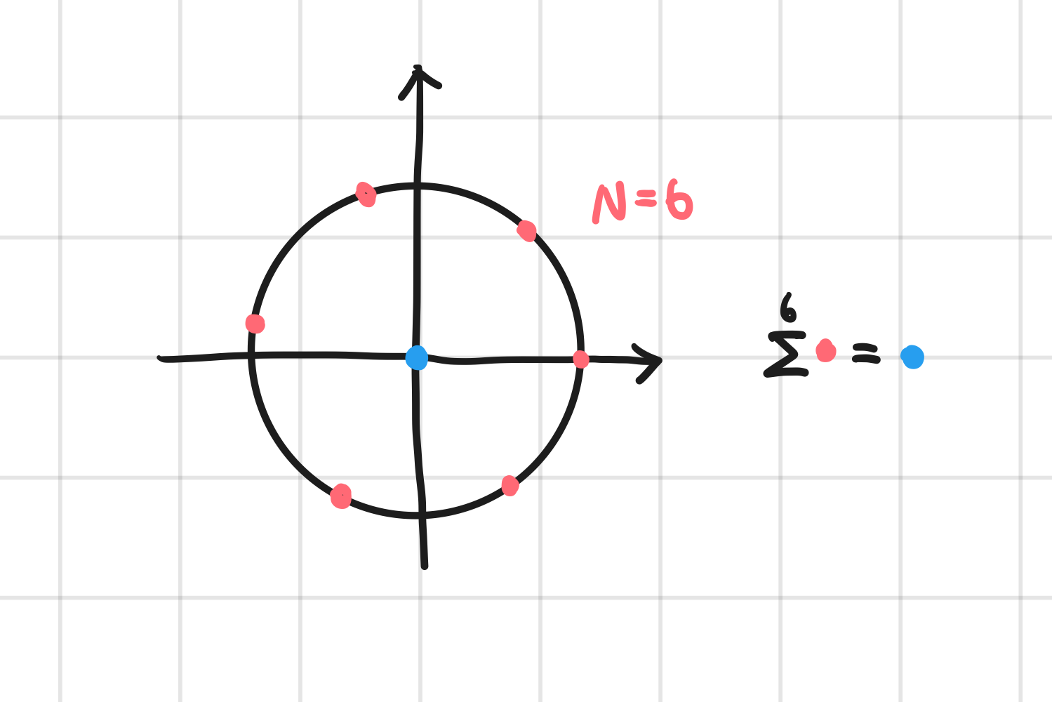 이때, 주기가 N이고 N개의 신호를 모두 더하고 있으므로, 복소평면 위를 생각해봤을 때, 신호의 총합은 원점에 있다. 따라서 $\sum$ 의 결과가 0이 된다.