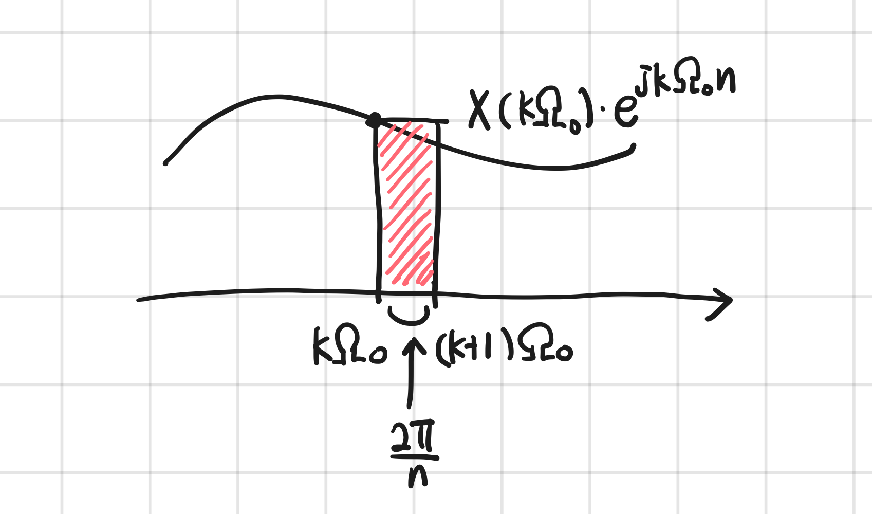 여기에서 $N\rightarrow\infty$ 의 상황에서 $X(k\Omega_0)e^{jk\Omega_0n}$ 가 함수값, $\frac{2\pi}{N}$가 너비를 의미한다고 생각하면 리만합을 통한 적분을 적용할 수 있다.