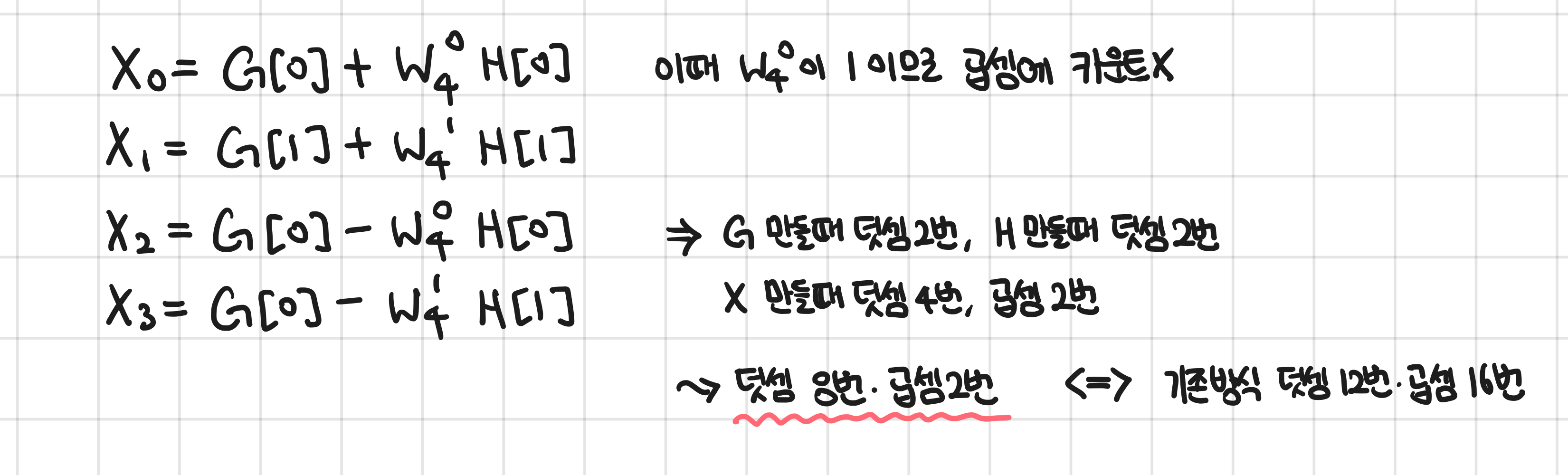 여기에서 한 번 더 중복을 찾아내주자. 오른쪽 복소수에서, 패턴을 찾을 수 있다. 해당 값들은 G, H, W 라는 배열로 미리 계산을 완료해두면 두 번 계산하지 않아도 되므로 효율적이다.
