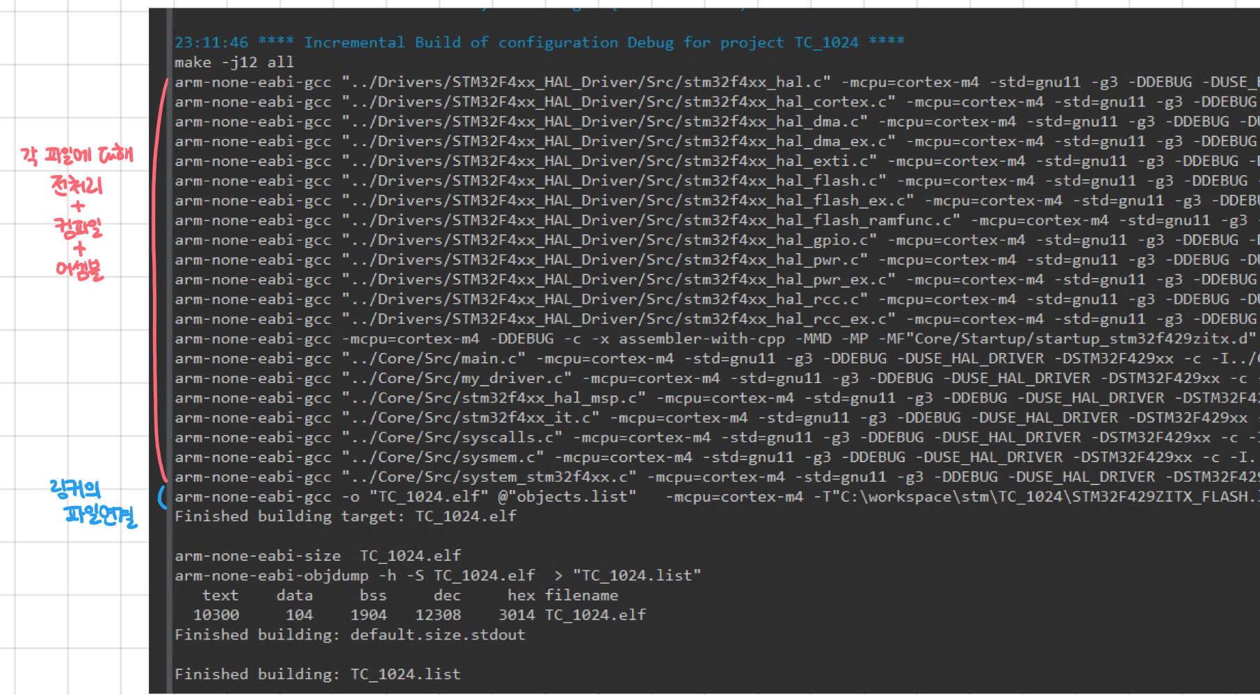 위 흐름이 STM Cube IDE에서는 어떤 과정으로 보여지는지 확인해보자. 우선 프로젝트를 빌드했을 때 나오는 로그를 간단하게 살펴보면 아래와 같다.
