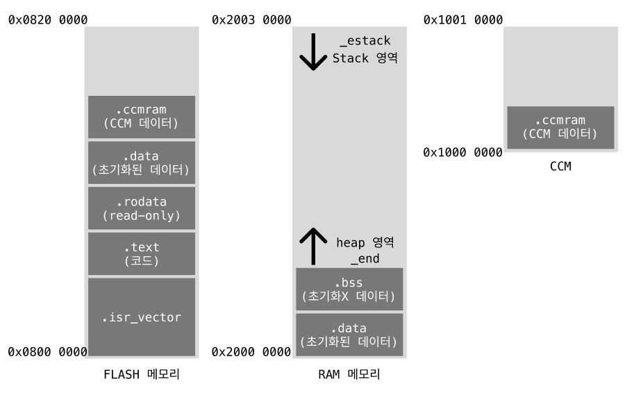위 FLASH, RAM, CCM을 표현한 그림에서 RAM 메모리를 그림처럼 구축하는 역할을 담당한다. (저런 구조가 되는게 기본적인 컴구조의 프로그램 단위라고 배웠던 것 같은데, 펌웨어에서는 보드 위에 프로그램이 하나만 돌게 되니깐 요런 구조가 시스템의 전체 메모리 구조가 된다.)