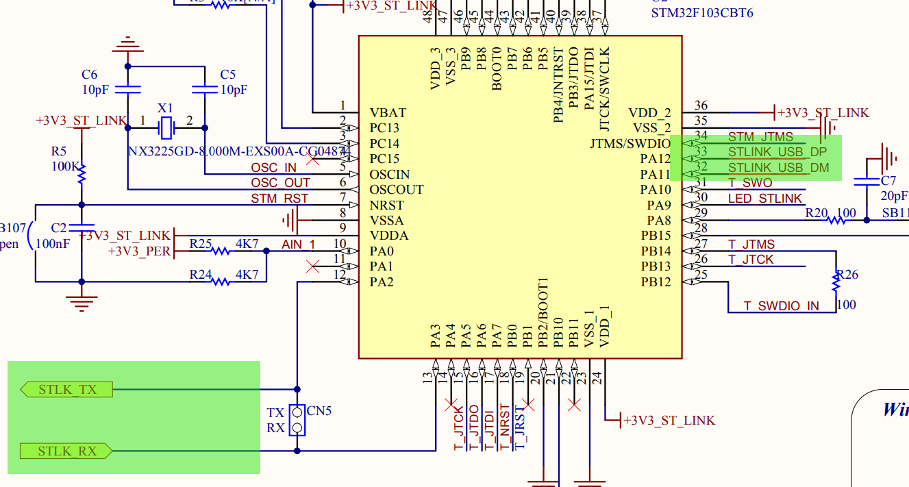 MCU(DTE) → UART → UART to USB(DCE) → USB → USB to UART(DCE) → UART → PC 로 넘어가기 때문에, 여기에서는MCU와 USB 사이의 통신 전달을 위해서 UART를 사용한다고 봐야한다. 에 대해서 질문을 했는데, USB는 단순히 데이터 버스의 역할이기 때문에 USB가 DCE의 역할을 한다…? 고 보기는 조금 애매한 감이 있음. 그러나 메인 MCU와 ST-Link 쪽의 작은 MCU 둘은 회로도를 살펴보면 둘이 직접 TX와 RX가 꼬인 채로 연결이 되어있어서 이 친구들은 널 모뎀이라고 볼 수 있다.