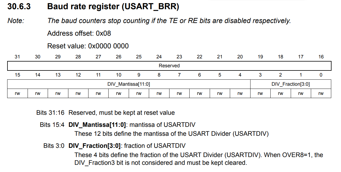 혹시 BRR 값 계산 방법이 궁금하다면 레퍼런스 메뉴얼 문서를 찾아보자! Oversampling 8 / 16 상황에 대해서 BRR 계산 방법에 대해서 예시가 친절하게 작성되어있다. (거기에 오타도 있음 ㅋㅋ)