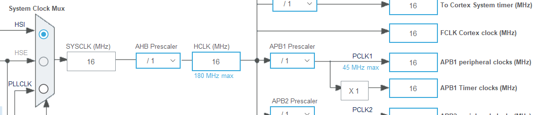 여기에서 언급되는 PCLK 주파수는 Clock Configuration 세팅에서 값을 확인해줄 수 있었다. APB1 Peripheral CLK으로 연결되는 클럭이 PCLK에 해당한다. (Peripheral CLK일까..?)