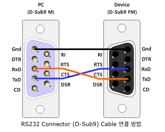 - Device1의 송신 포트 TX → Device2의 수신 포트 RX