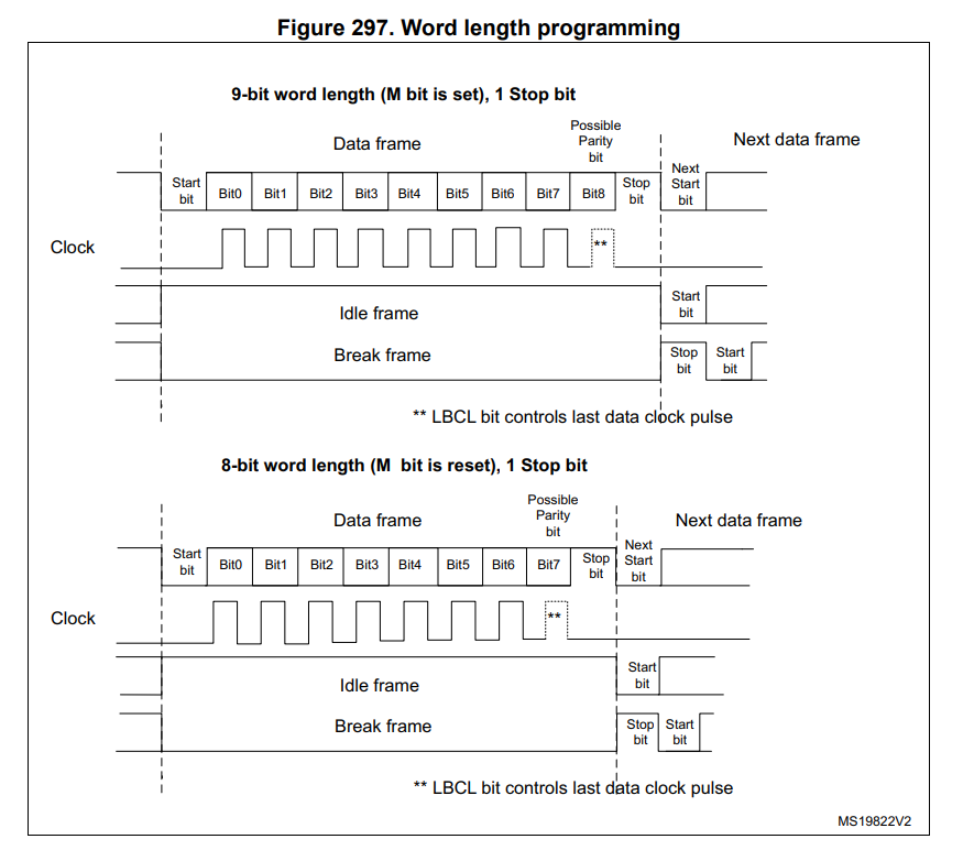 데이터를 쓰거나 읽기 위해서는 USART_DR 레지스터를 이용하면 된다. DR 레지스터에 값을 쓰려 할때는 Address Decoder에 의해 TDR로, 읽으려고 할 때는 RDR로 HW 적으로 레지스터를 지정해준다. 그리고 이 값에 Bit를 작성해넣으면 앞서 봤던 전송 로직이 시작된다.