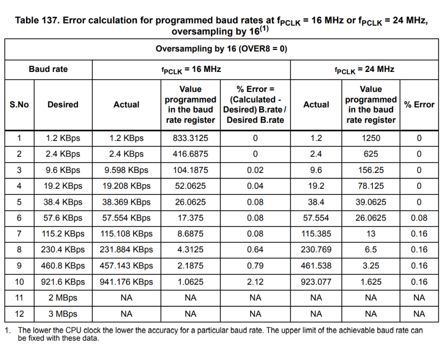 만약 oversampling을 16으로 하는 경우에, 통신에 사용할 수 있는 최대 주파수는 $f_{PCLK} / 16$ 라고 한다. 아무래도 통신에 사용하는 주파수보다 16배나 더 자주 비트를 쪼개어 확인해야 하기 때문에 최대 주파수를 샘플링 주파수에 맞춰주는 것으로 생각된다.