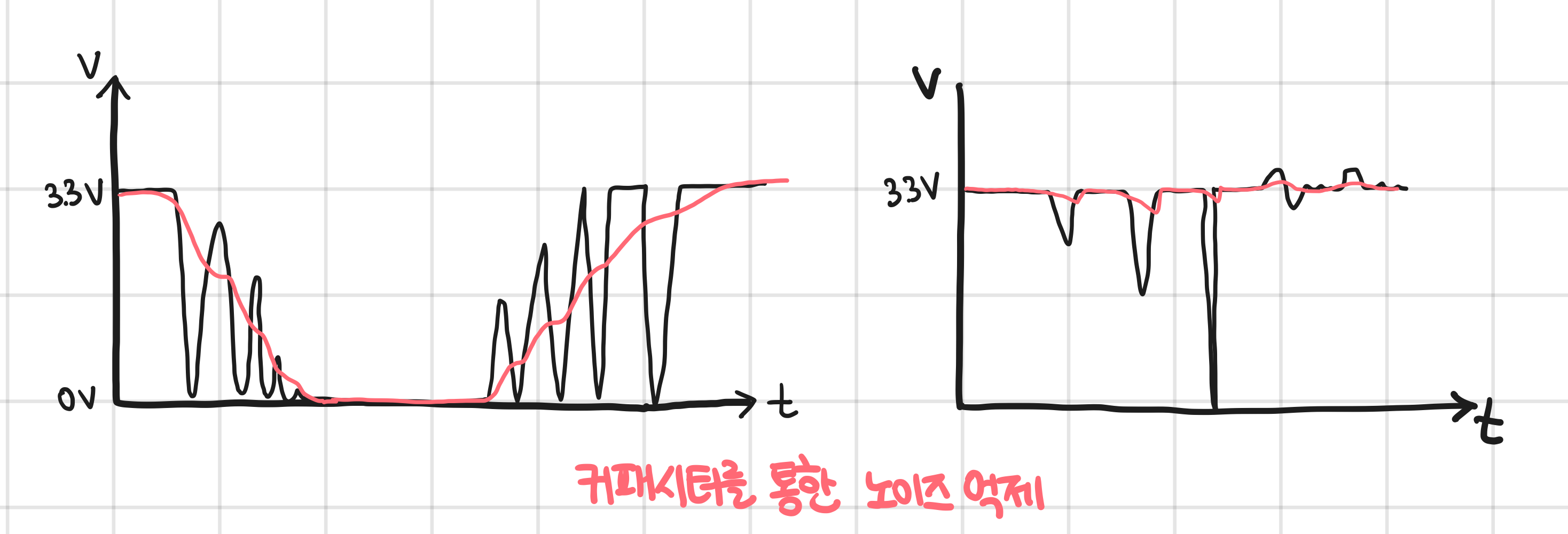 - 커패시터가 처리하는 노이즈 : 커패시터는 전압의 변화를 방해한다.