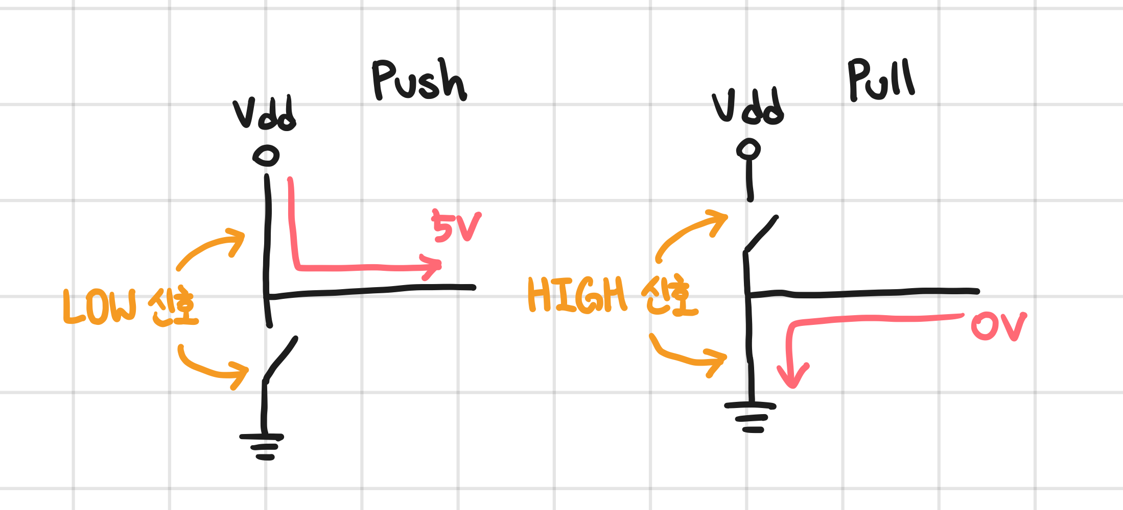 아래에 그려준 푸시풀과 오픈드레인 회로 그림에서 스위치 처럼 그려둔 부분들은 모두 NMOS와 PMOS이다. 스위칭 동작을 한다는 것을 조금 더 직관적으로 볼 수 있게 그려둔 것이다. 오해하지 말자!
