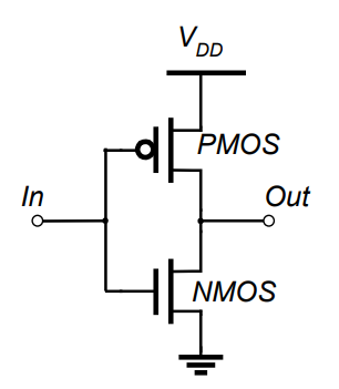 2가지 종류의 MOSFET을 사용한다. (사실 입력 게이트에다가 not 붙인거니깐 종류는 하나라고 봐도 무방하지 않나…) PMOS(Positive MOSFET)는 Gate로 신호가 1이 들어가면 전류를 차단하고, NMOS(Negative MOSFET)는 Gate로 신호가 1이 들어가면 전류를 통과시킨다. 그리고 아래처럼 PMOS를 Vdd와, NMOS를 GND와 연결하는 회로를 구성한 것을 CMOS(Combinational MOSFET) 회로라고 부른다.